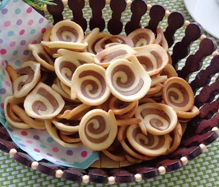 Bạn cần chia bột làm hai phần màu trắng và màu nâu và cuộn tròn lại rồi cắt để tạo hình xoáy trôn ốc đẹp mắt cho bánh